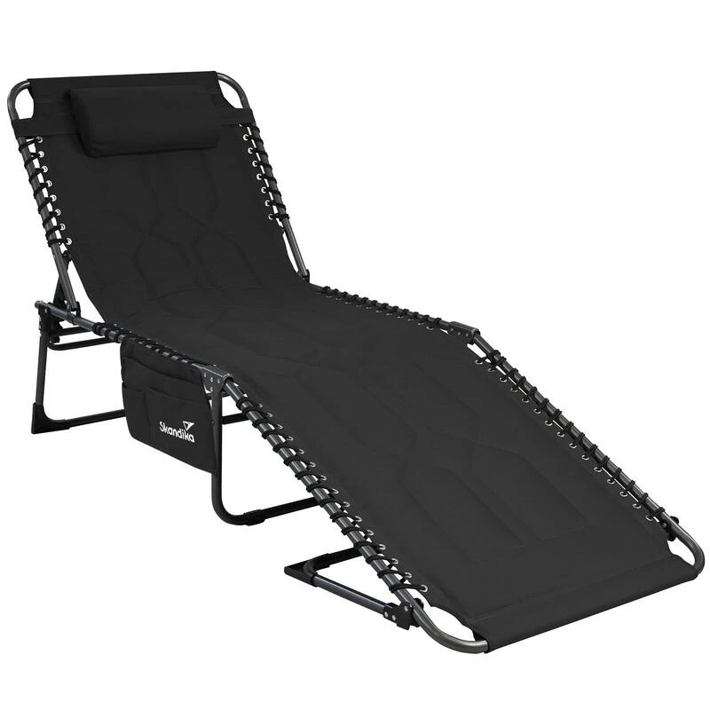 Chaise longue transat de camping pliable, rembourrée, réglable en 5 positions, appui-tête réglable, supporte max. 150 kg, hydrofuge, cadre en acier, coussin de tête amovible