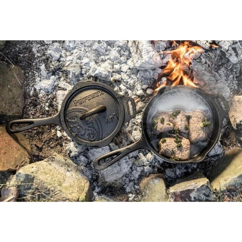 Cette poĂȘle en fonte prĂ©sente une base plate et une poignĂ©e ergonomique pour une manipulation facile sur une flamme ouverte ou une cuisiniĂšre.