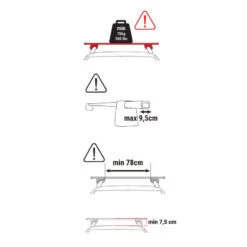 La largeur utile est de 78cm, la distance entre le toit et le haut de la barre de toit doit être supérieure à 7,5cm et la largeur du tube de la barre de toit doit être inférieure à 9,5cm (voir les schémas sur les photos de cette fiche produit).